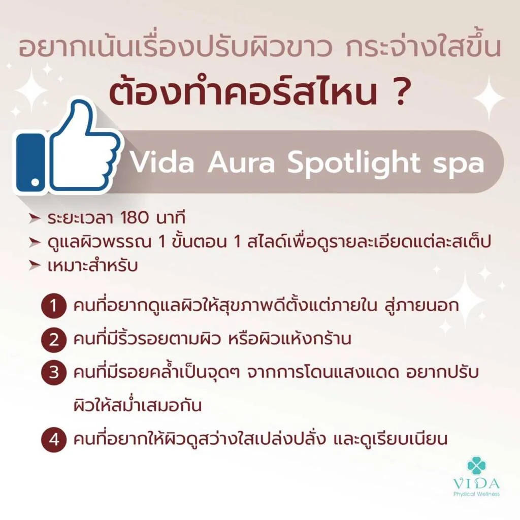 มหัศจรรย์การทำสปาผิวขาวออร่า ทรีตเมนต์สุดพิเศษเฉพาะ VIDA Physical Wellness รวบรวมเคล็ดลับการดูแลผิวที่ดีที่สุดจากทั่วโลกเพื่อความใฝ่ฝันของการมีผิวเปล่งปลั่ง สุขภาพดี และเปี่ยมไปด้วยวิตามินสำคัญในการบำรุงผิวพรรณจากสปาผิว Spot Light ที่ไม่เหมือนใคร